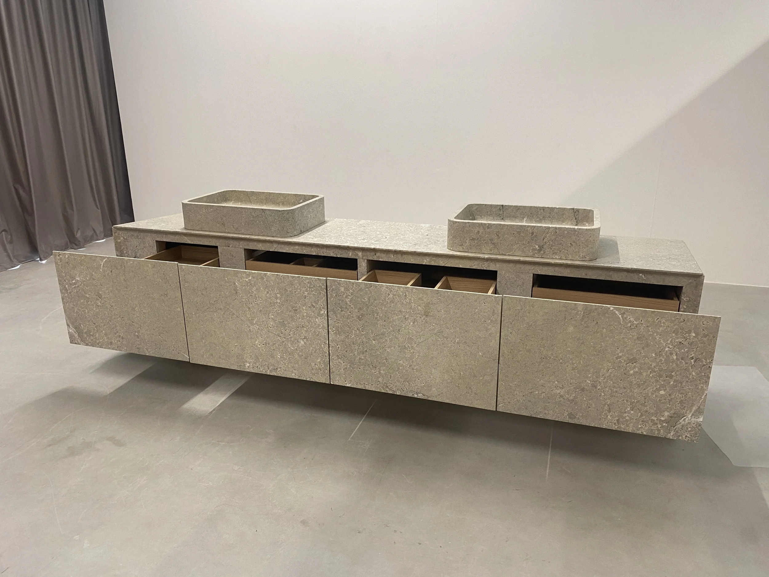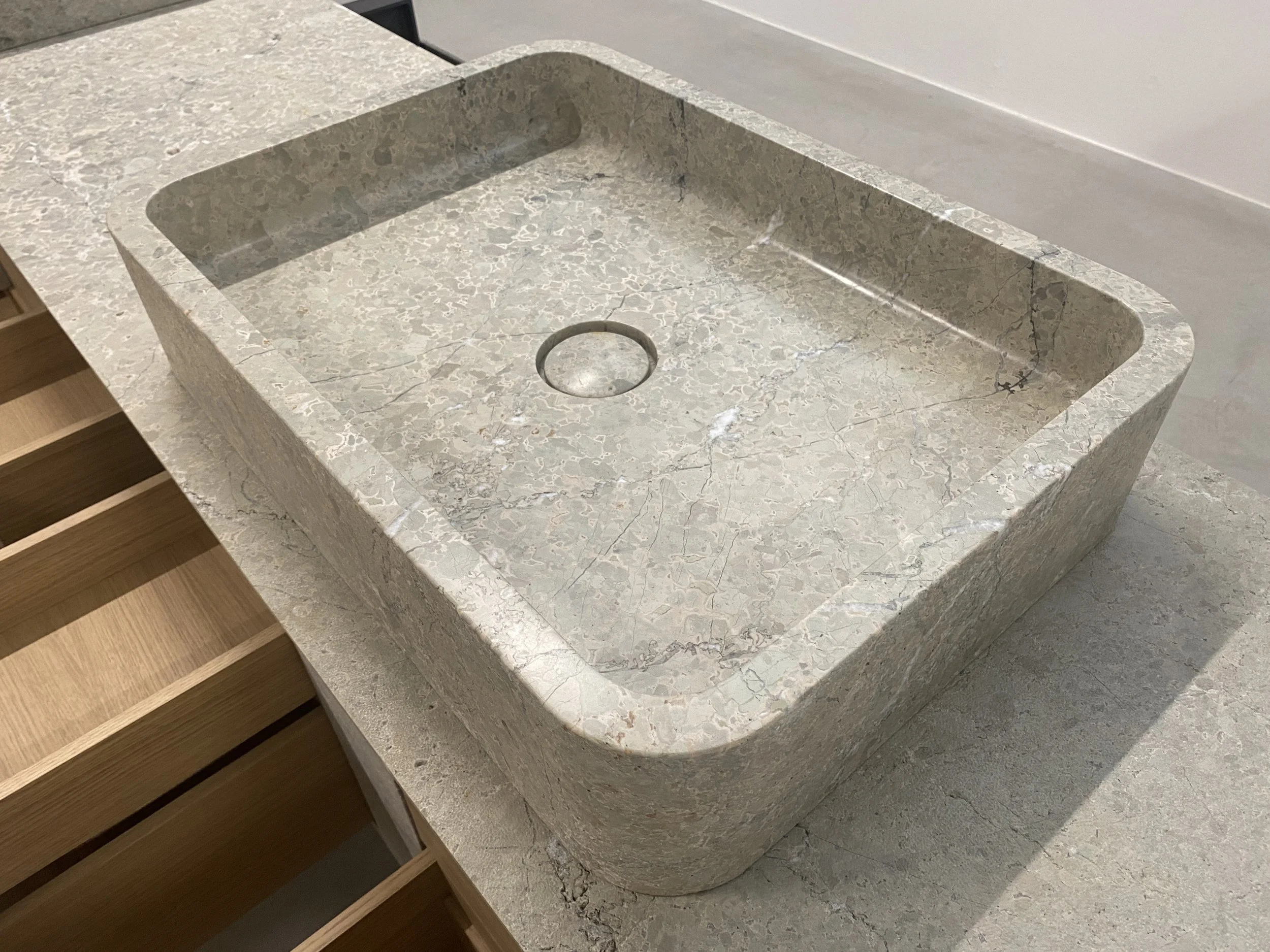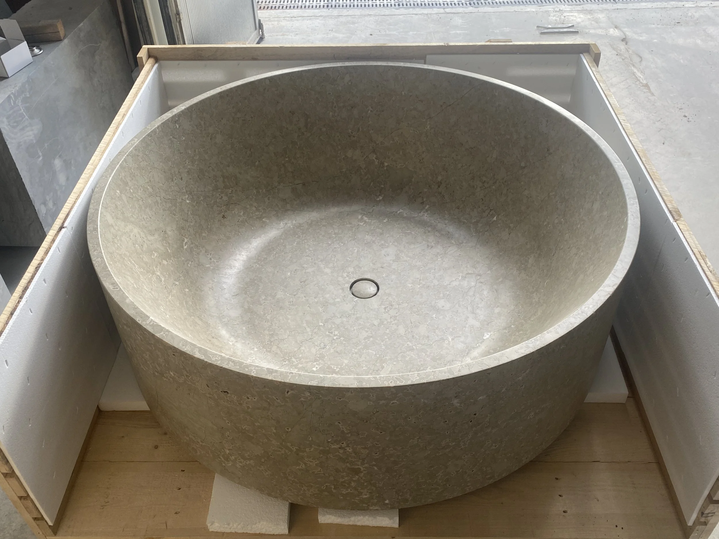 Although made solid from blocks of stone, these pieces have a delicate appearance due to the gentle curves of their contemporary design. The simplicity of the tub and vanity accentuate this superb selection of natural material.