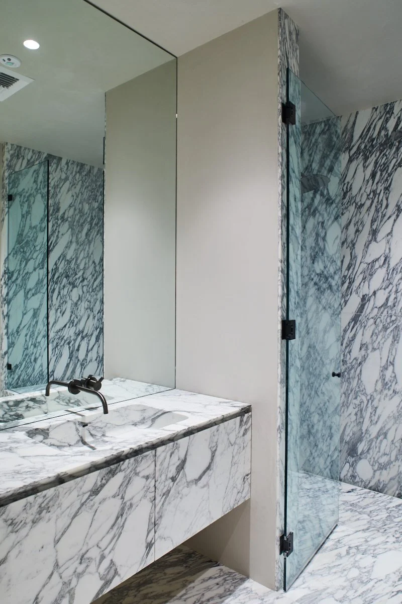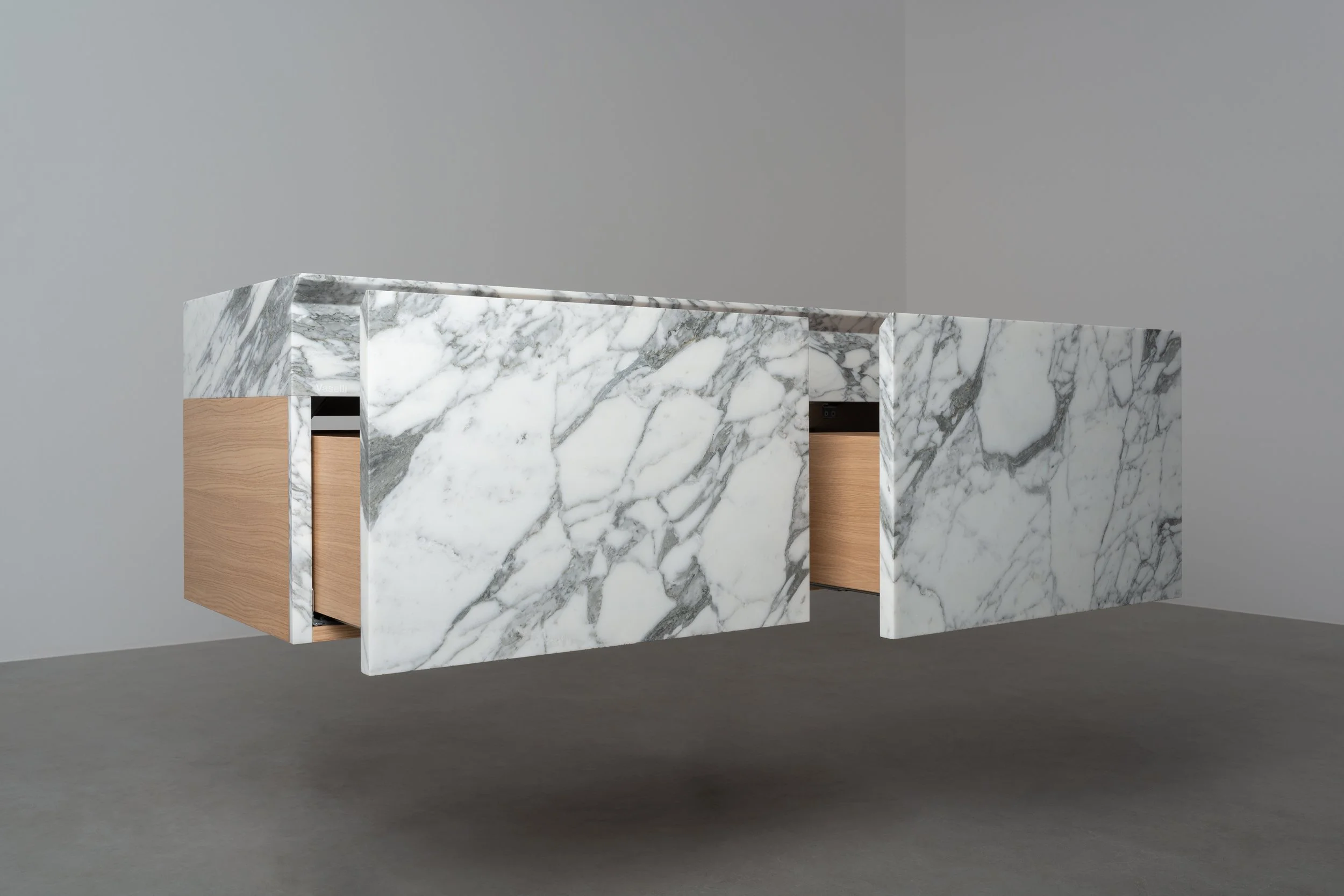 Two suspended vanities, carved from blocks of Arabescato Viola and Arabescato Corchia Marble, were made for Roc Nation’s Los Angeles office.
